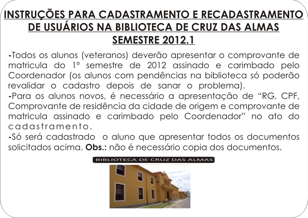 INSTRUÇÕES PARA CADASTRAMENTO E RECADASTRAMENTO DE USUÁRIOS NA BIBLIOTECA DE CRUZ DAS ALMAS: SEMESTRE 2012.1