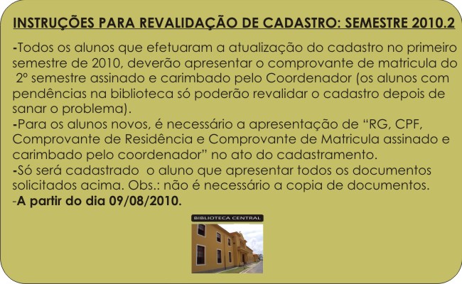 INSTRUÇÕES PARA REVALIDAÇÃO DE CADASTRO: SEMESTRE 2010.2
