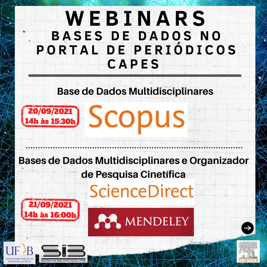 O Sistema de Bibliotecas da UFRB em parceria com a Editora Científica Elsevier oferece o Terceiro Ciclo de treinamentos nas bases de dados presentes no portal de periódicos Capes, tendo como público alvo toda a Comunidade da UFRB.