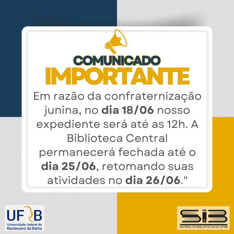 Em razão da confraternização junina, no dia 18/06 nosso expediente será até as 12h. A Biblioteca Central permanecerá fechada até o dia 25/06, retomando suas atividades no dia 26/06."