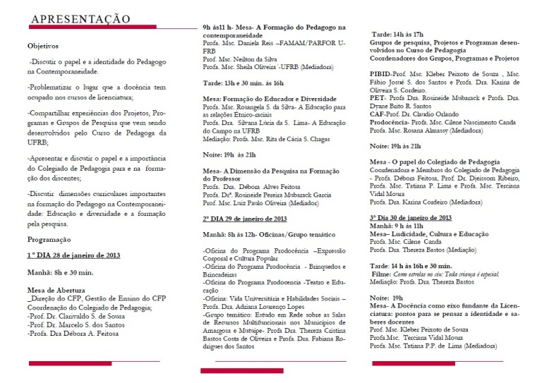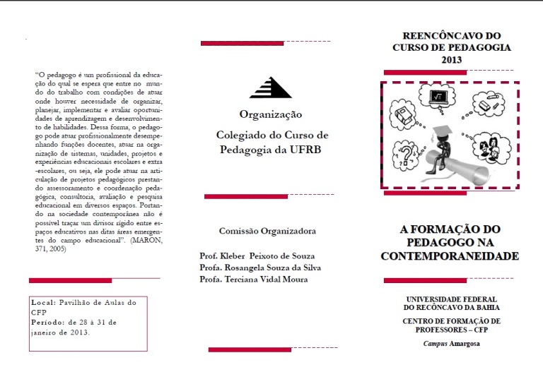 Já está disponível a programação do Reencôncavo 2013 do curso de Pedagogia, que será realizado no CFP nos dias 28 a 31 de janeiro.