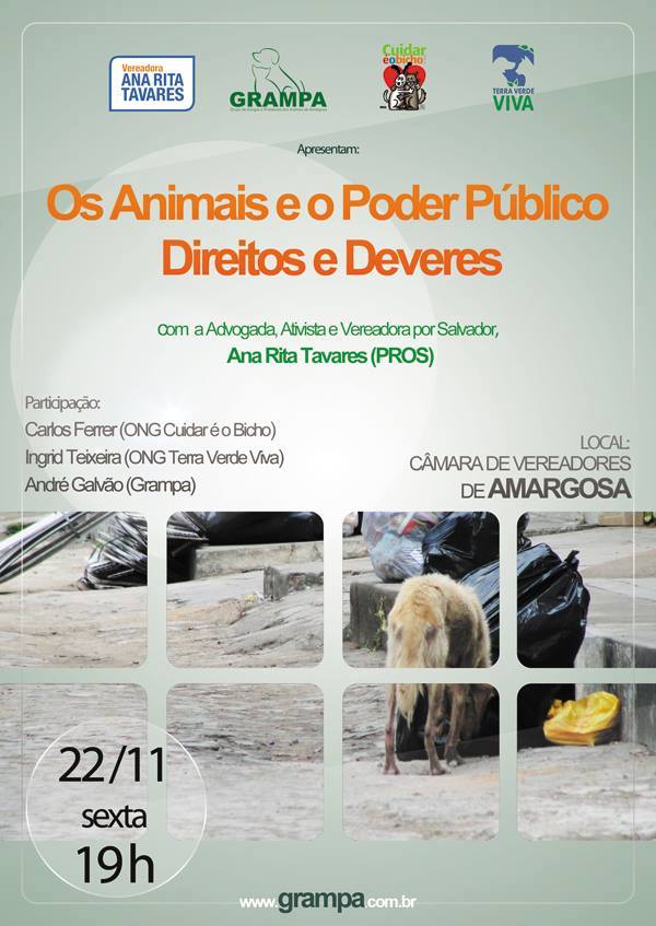O GRAMPA em parceria com a vereadora por Salvador Ana Rita Tavares (PROS), a ONG Cuidar é o Bicho e a ONG Terra Verde Viva, promoverá no dia 22 de novembro às 19 horas na Câmara Municipal, o seminário “Os Animais e o Poder Público - Direitos e Deveres”.