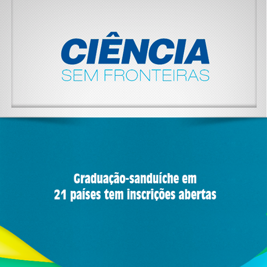 O programa Ciência sem Fronteiras está com inscrições abertas para graduação-sanduíche em 21 países de destino — Alemanha, Austrália, Áustria, Bélgica, Canadá, China, Coréia do Sul, Espanha, EUA, Finlândia, França, Holanda, Hungria, Irlanda, Itália, Japão, Noruega, Nova Zelândia, Polônia, Reino Unido e Suécia.