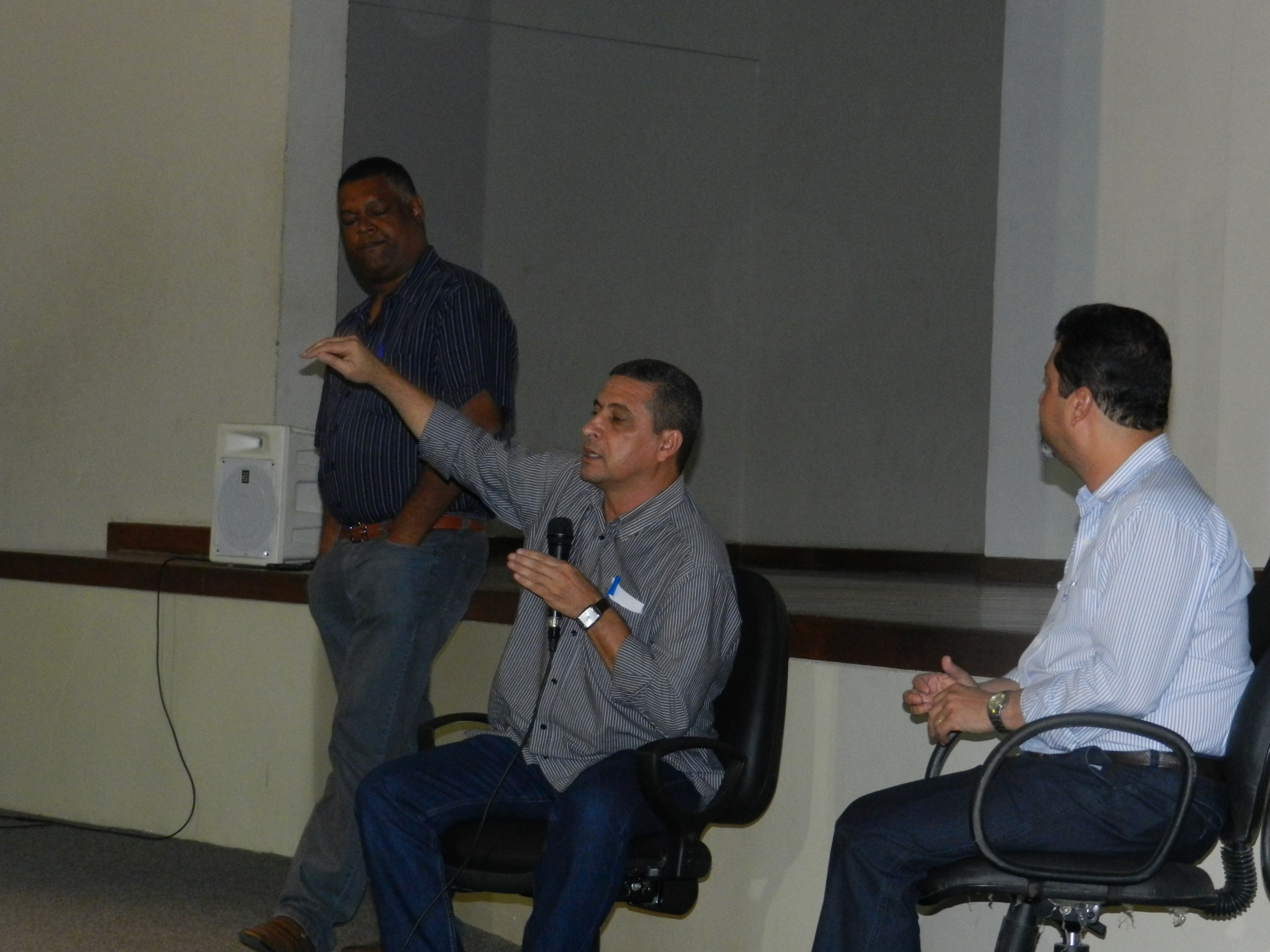Fabio Lima, aluno de Gestão Pública, apresentando à turma os convidados Antonio Pimentel e Roque Santos.