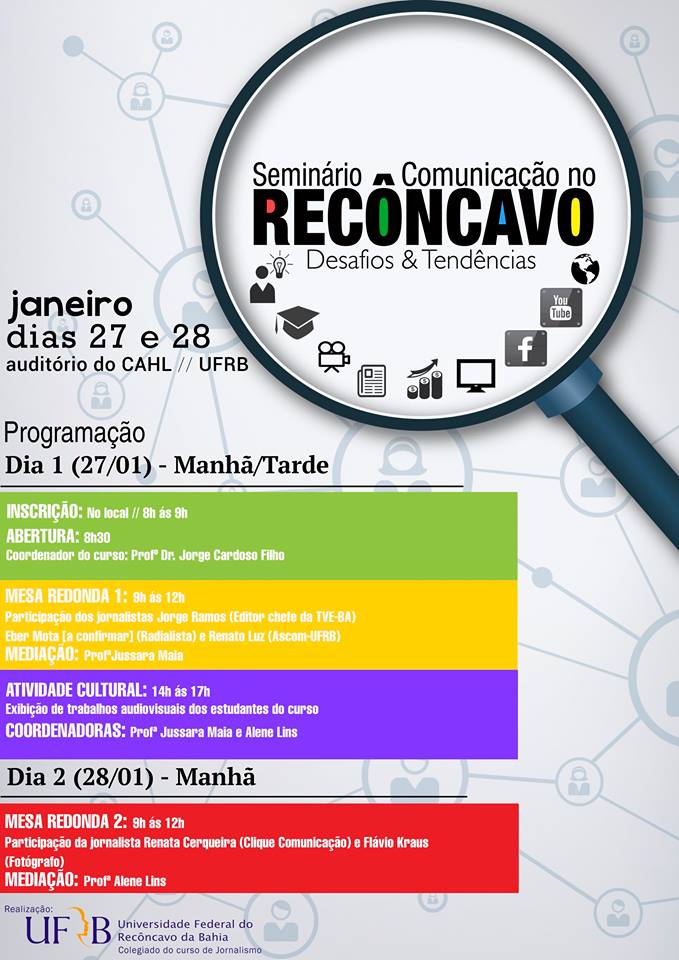 O tema do seminário, promovido pelo colegiado do curso de Jornalismo da UFRB, é “Comunicação no Recôncavo: desafios e tendências”. A programação terá, nos dois dias, mesas-redondas pela manhã e uma mostra de trabalhos audiovisuais produzidos pelos estudantes de Jornalismo no período da tarde.