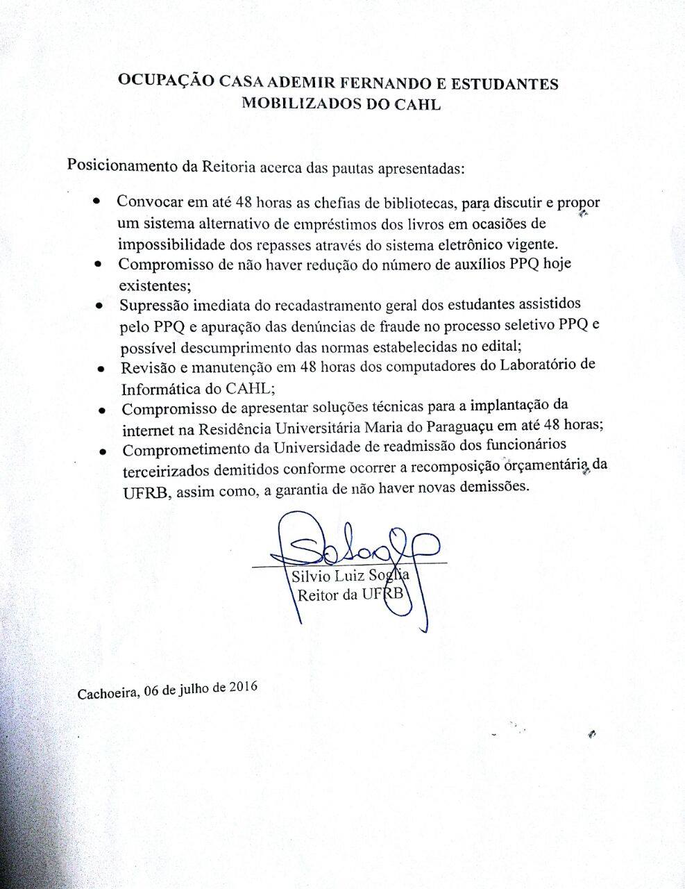No dia 06 de julho, às 14:00, ocorreu uma nova rodada de discussão no auditório do CAHL, com a presença da Reitoria e da PROPAAE. Encerrado o debate, os discentes apresentaram à Reitoria uma série de reivindicações, com as quais o Reitor se comprometeu através da assinatura de um documento (Anexo I). A Direção do CAHL aguarda o desenrolar das negociações e a decisão da assembleia estudantil a ser realizada hoje, 07 de julho, às 20:00.