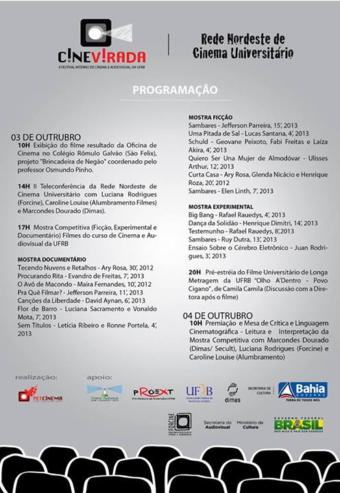 O grupo PET-Cinema realizará a Cine Virada – II Festival Interno de Cinema e Audiovisual da UFRB juntamente com a Rede Nordeste de Cinema Universitário, o evento programado para os dias 03 e 04 de outubro acontecerá no Auditório do Quarteirão Leite Alves, no Centro de Artes, Humanidades e Letras (CAHL-UFRB).