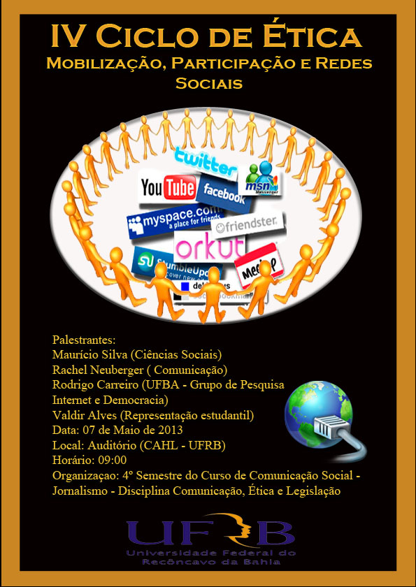 O curso de Comunicação Social - Jornalismo, através da disciplina Comunicação, Ética e Legislação, realizará no dia 07 de maio, a partir das 09h00, o IV Ciclo de Ética. O evento será no auditório do Centro de Artes, Humanidades e Letras e contará com a participação de Prof.ª Rachel Neuberger (Comunicação Social/Jornalismo - UFRB), Prof. Maurício Silva (Ciências Sociais - UFRB), Valdir Alves (Ciências Sociais - UFRB) e Rodrigo Carreiro (Grupo de Pesquisa Internet e Democracia - UFBA).