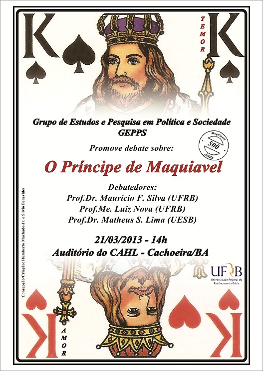 No dia 21 de março, às 14h00, será realizada uma mesa redonda sobre os 500 anos da obra clássica de Nicolau Maquiavel: O Príncipe. O evento, que acontecerá no auditório do CAHL, tem como objetivo abordar, sob variadas perspectivas, a importância desta obra, que permanece viva e formando gerações de pensadores. O evento é uma realização do Grupo de Estudos e Pesquisa em Política e Sociedade (GEPPS).