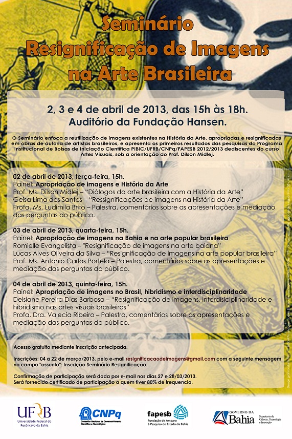 A reutilização de imagens existentes na História da Arte, apropriadas e ressignificadas em obras de autoria de artistas brasileiros, é o enfoque do Seminário Ressignificação de Imagens na Arte Brasileira, que acontecerá nos dias 2, 3 e 4 de abril de 2013, das 15h às 18h, no Auditório da Fundação Hansen Bahia.