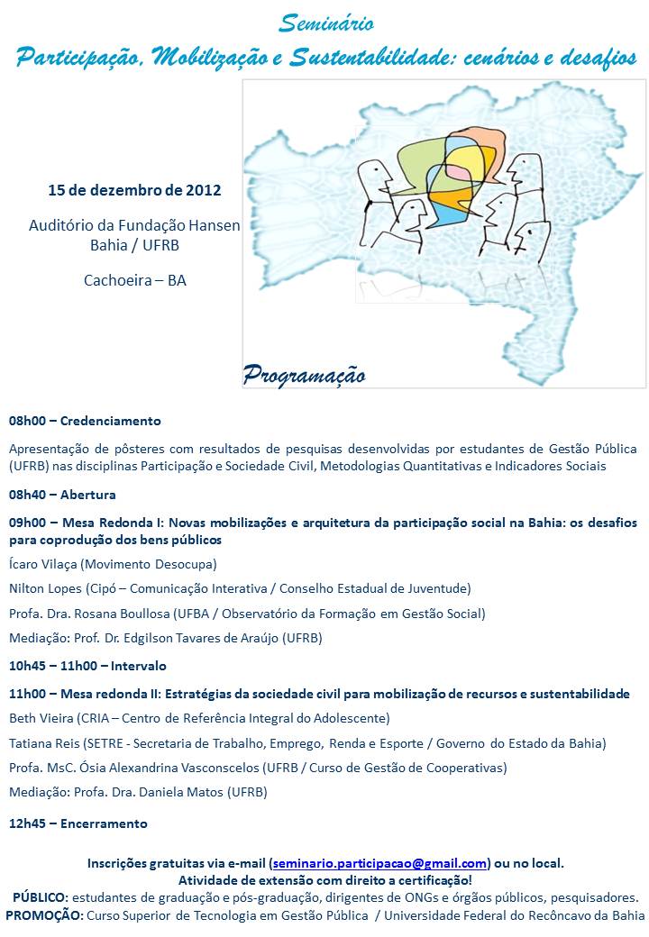 O seminário é para os estudantes do Curso Superior de Tecnologia em Gestão Pública e demais interessados no tema, acontecerá no dia 15, no auditório da Fundação Hansen Bahia. As inscrições podem ser feitas até o dia 15/12, no Colegiado do curso.