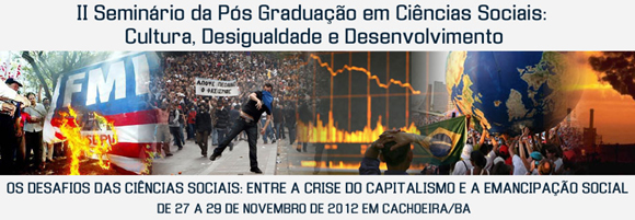 O II Seminário do Programa da Pós-Graduação em Ciências Sociais da Universidade Federal do Recôncavo da Bahia (PPGCS/UFRB) é um evento com natureza científica e acadêmica e tem a finalidade de estimular a pesquisa e o intercâmbio das Ciências Sociais em âmbito regional e nacional, ele vai acontecer entre os dias 27 e 29 de novembro de 2012, no Centro de Artes, Humanidades e Letras (CAHL) da UFRB, em Cachoeira.