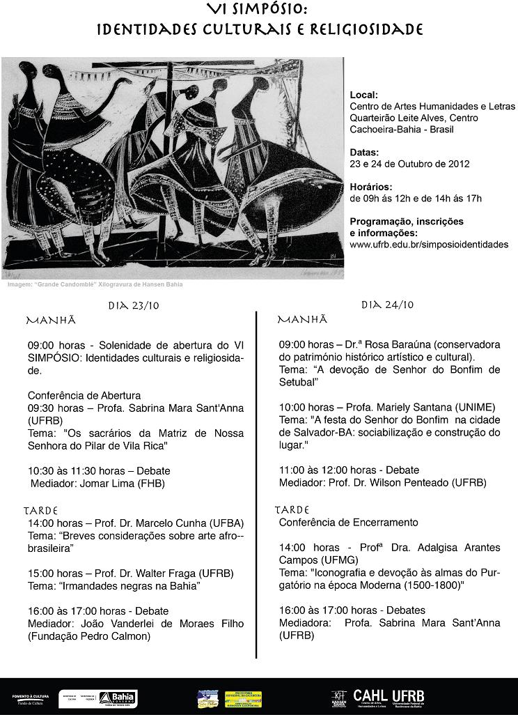 Começa amanhã o VI Simpósio: Identidades Culturais e Religiosidade, que tem como proposta discutir sobre as particularidades culturais e religiosas na região do Recôncavo da Bahia, tendo em vista sua pluralidade, sincretismo e influências de diversas partes do mundo, com especial destaque à África. O evento é voltador para estudantes de diferentes níveis, profissionais e pesquisadores, visitantes das cidades e comunidade do Recôncavo.