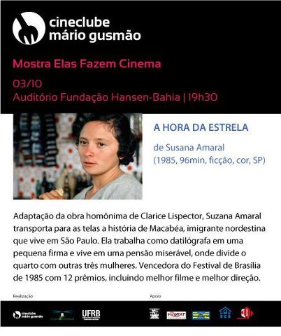 Hoje à noite o Cineclube Mário Gusmão exibe o filme A Hora da Estrela, com direção de Suzana Amaral, retomando as atividades da mostra "Elas Fazem Cinema". A exibição vai acontecer no auditório da Fundação Hansen Bahia, às 19h30. Este filme é uma adaptação do livro homônimo de Clarice Lispector, que conta a história de Macabéa, uma mulher que sai do Nordeste para morar em São Paulo. O Cineclube Mário Gusmão é um projeto de extensão vinculado ao curso de Cinema e Audiovisual da UFRB. Fundação Hansen Bahia fica na Rua 13 de maio, nº 13, Centro, em Cachoeira.