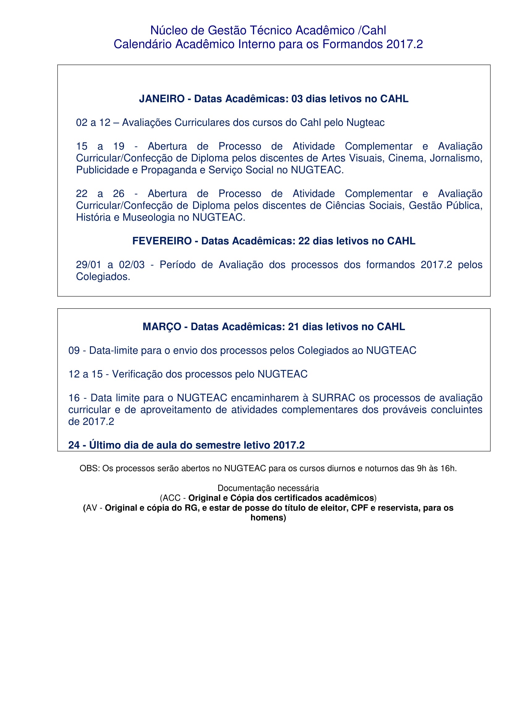 O Núcleo de Gestão Técnico Acadêmico do CAHL divulga Calendário Interno. Clique aqui para visualizar o documento.
