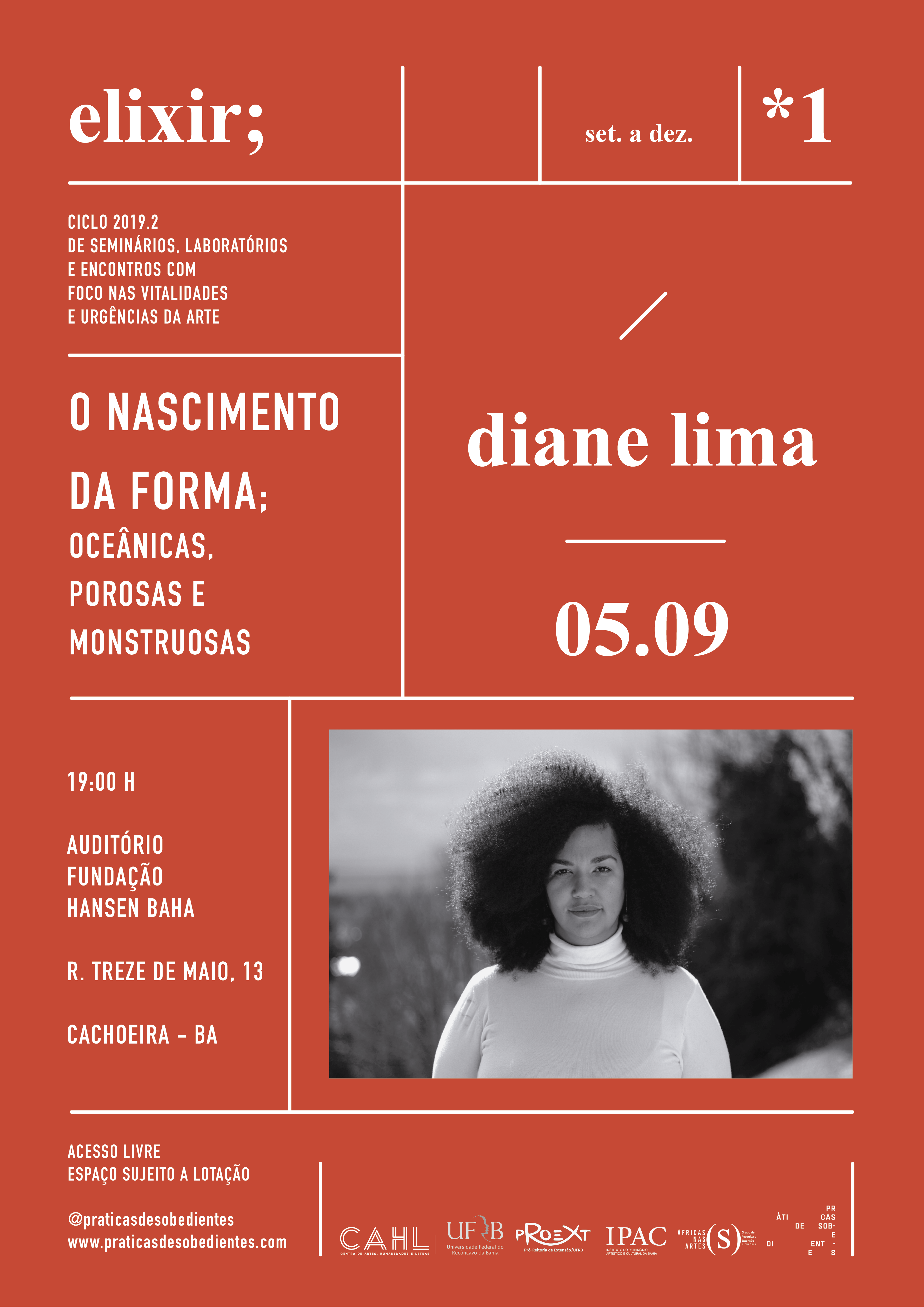 Elixir;! Nome que vem de preparo e composição. Poção rumo a vida longa e cheia de vitalidade. É nessa junção de vontades e pessoas que apresentamos o ciclo 2019.2 de seminários, laboratórios e encontros organizado pelos projetos de pesquisa e extensão África nas Artes e Práticas Desobedientes, ambos localizados no curso de Artes Visuais da Universidade Federal do Recôncavo da Bahia. O programa nasce estruturado sobre o desejo de fazer circular, a partir das urgências instaladas em nosso cotidiano, possibilidades de encontro e fruição artística partindo da ideia de que as práticas e as formas de pensamento em arte podem oportunizar o aparecimento de novas saídas e saúdes diante do tempo presente. Entre setembro e dezembro de 2019 receberemos uma série de artist_s, curador_s e pesquisador_s de diferentes esferas da arte contemporânea brasileira propondo encontros, experiências de compartilhamento e produção de conhecimento. Elixir; é também um pontapé inicial para a construção/fortalecimento de redes e geografias (in/trans) disciplinares que despontam, em diferentes partes do Brasil, entendendo a importância da ressignificação das noções de centralidade, conhecimento, criação e potencialização de saberes.