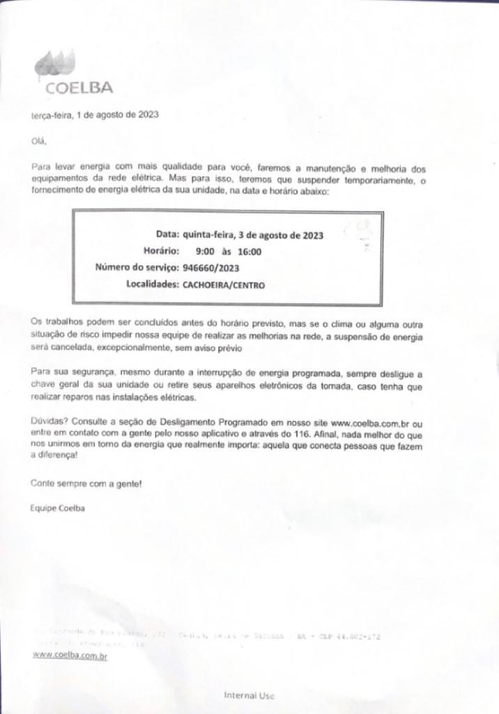 Em decorrência da interrupção do fornecimento de energia elétrica anunciada pela Neoenergia Coelba, orientamos a suspensão das atividades acadêmicas no Campus Cachoeira, excepcionalmente no dia 03/08, das 09h às 16h. Durante esse período, as atividades administrativas ocorrerão em modo remoto até as 16h. Clique aqui para visualizar o aviso de suspensão temporária, divulgado pela concessionária.