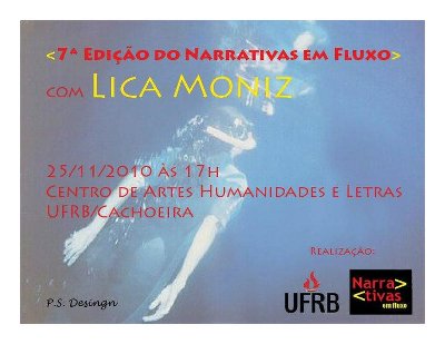 O projeto de extensão Narrativas em Fluxo recebe, neste mês de novembro, a artista plástica baiana Lica Moniz. Nesta edição (dia 25/11 às17h), teremos apresentação do portfólio e a leitura de dossiês sobre a pesquisa de mestrado intitulada “tempo de fundo: a arte, o mar e algumas correspondências”. A pesquisa realizada no mestrado em Artes Visuais (PPGAV/EBA/UFBA) rendeu a Lica Moniz uma exposição homônima, que foi exposta no MAM – Museu de Arte Moderna da Bahia, no ano 2009.