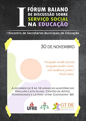 No dia 30 de novembro, das 9 às 16 horas será realizado o I Fórum Baiano de Discussão sobre Serviço Social na Educação. O evento é organizado pelo Grupo de Trabalho de Serviço Social na Educação da UFRB. As inscrições podem ser feitas pelo email Este endereço de email está sendo protegido de spambots. Você precisa do JavaScript ativado para vê-lo., bastando para isso enviar Nome, Email e Instituição (Ensino e Trabalho).