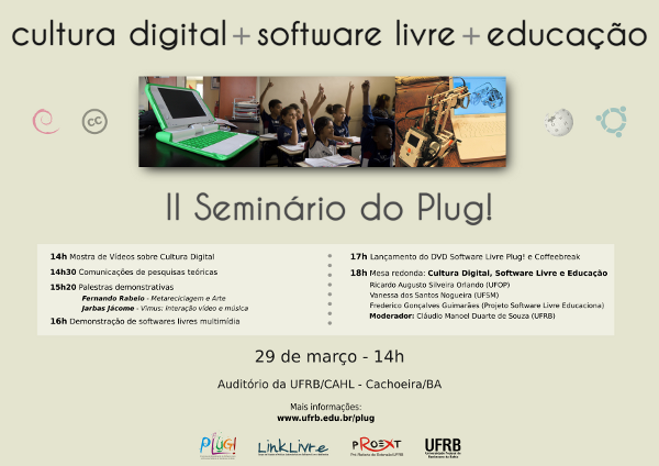 O seminário, que acontecerá no dia 29 de março às 14h no Auditório do CAHL-UFRB, em Cachoeira, contará com Mostra de Vídeos sobre Cultura Digital, Comunicações das pesquisas teóricas dos estagiários, Palestra demonstrativa de Fernando Rabelo sobre Metareciclagem e Arte, Palestra demonstrativa de Jarbas Jácome sobre o Vimus (software livre criado pelo palestrante que associa música e vídeo). O seminário contará ainda com workshops demonstrativos de software livre (Audacity, com César Velame; e Kino, com Wille Marcel). No final da tarde, acontecerá o lançamento do DVD Software Livre Plug!.