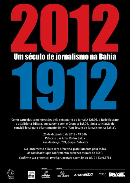 No próximo dia 20 de dezembro, a partir das 19h30, no Palacete das Artes, em Salvador-BA, será realizado o lançamento do livro em comemoração aos cem anos de A Tarde. O texto principal, que retrata os principais acontecimentos do último século vistos pela ótica do jornal, é de autoria do Prof. Dr. Carlos Ribeiro, professor do curso de Jornalismo da Universidade Federal do Recôncavo da Bahia (UFRB) e coordenador da área de conhecimento de comunicação. Segundo o professor, a edição é de luxo e conta com um trabalho editorial primoroso, feito pela editora Solisluna. “Quem confirmar presença poderá contar com um exemplar gratuitamente”, informa.