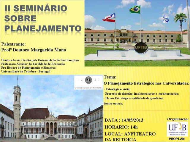 Convidamos a todos para Seminário cuja o tema é: “Planejamento estrátegicos nas Universidades”, a ser realizado dia 14 de Maio de 2013, às 14h00, no anfiteatro, prédio da Reitoria. Este seminário será ministrado pela Prof.ª Doutora Margarida Mano, Pró-Reitora de Planejamento e Finanças da Universidade de Coimbra.