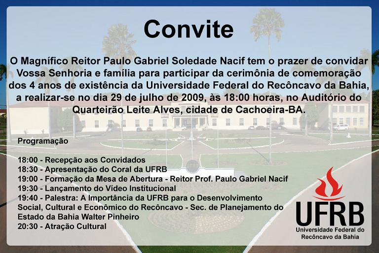 Dia 29, no Auditório do Quarteirão Leite Alves, em Cachoeira, acontece uma cerimônia de comemoração aos 4 anos de existência da UFRB.