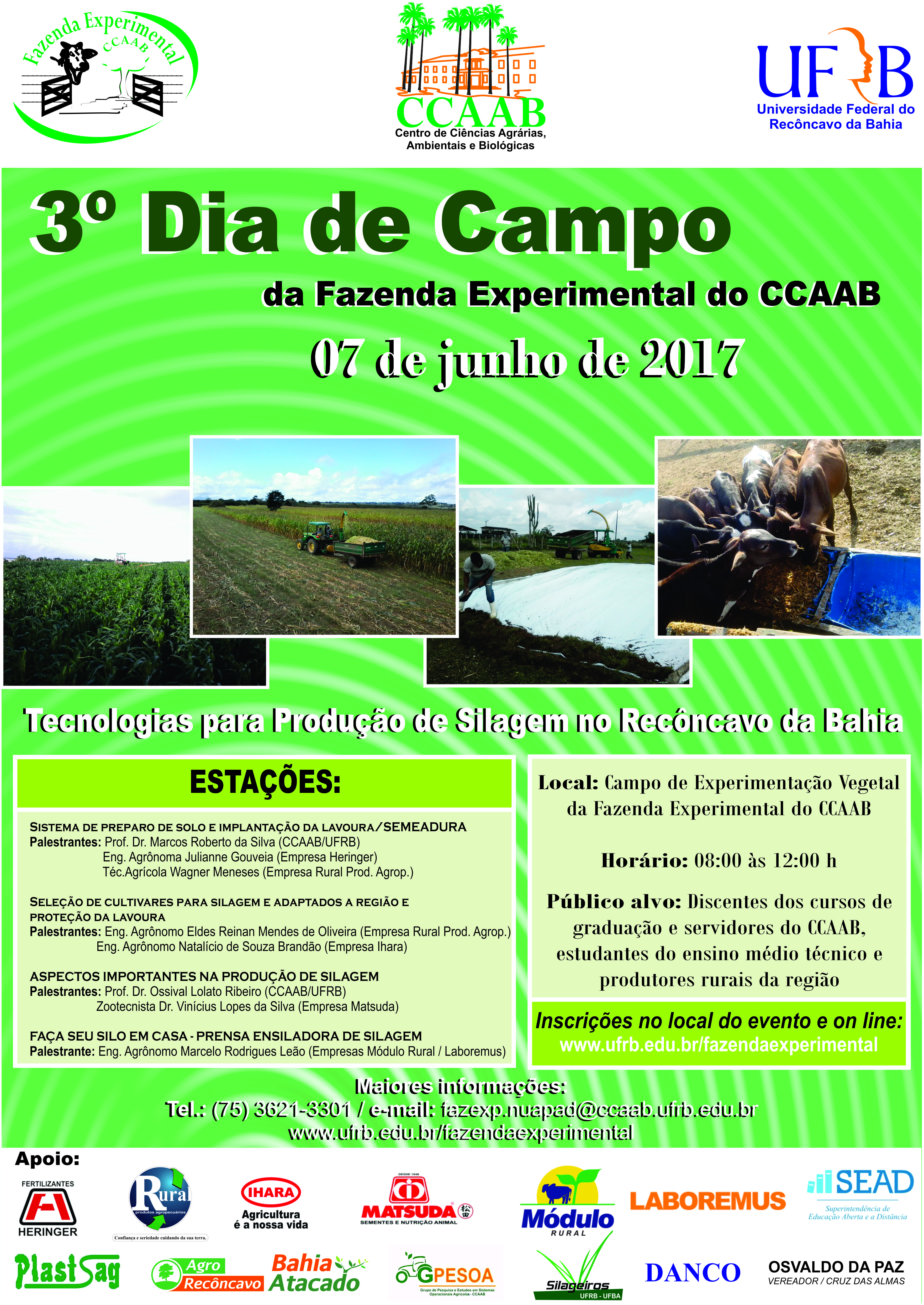O Centro de Ciências Agrárias, Ambientais e Biológicas (CCAAB/UFRB), por meio da Fazenda Experimental convida toda comunidade acadêmica para o 3º Dia de Campo da Fazenda Experimental do CCAAB: “Tecnologias para Produção de Silagem”, a ser realizado no dia 07 de junho de 2017 no Campo de Experimentação Vegetal do CCAAB/UFRB, das 08:00 h as 12:00 h.