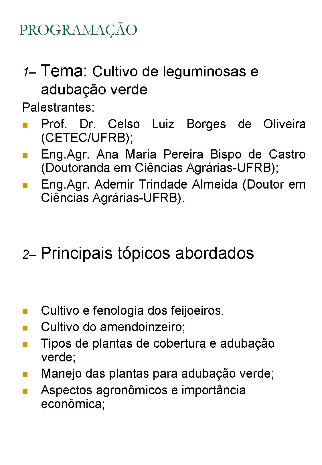 O evento inicia com a "1ª Aula Técnica: Cultivo de leguminosas e adubação verde".