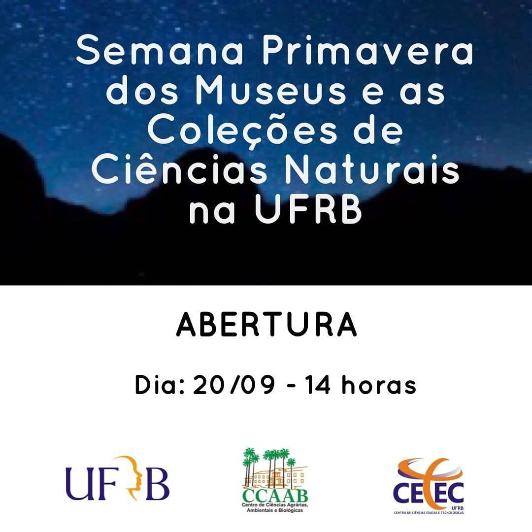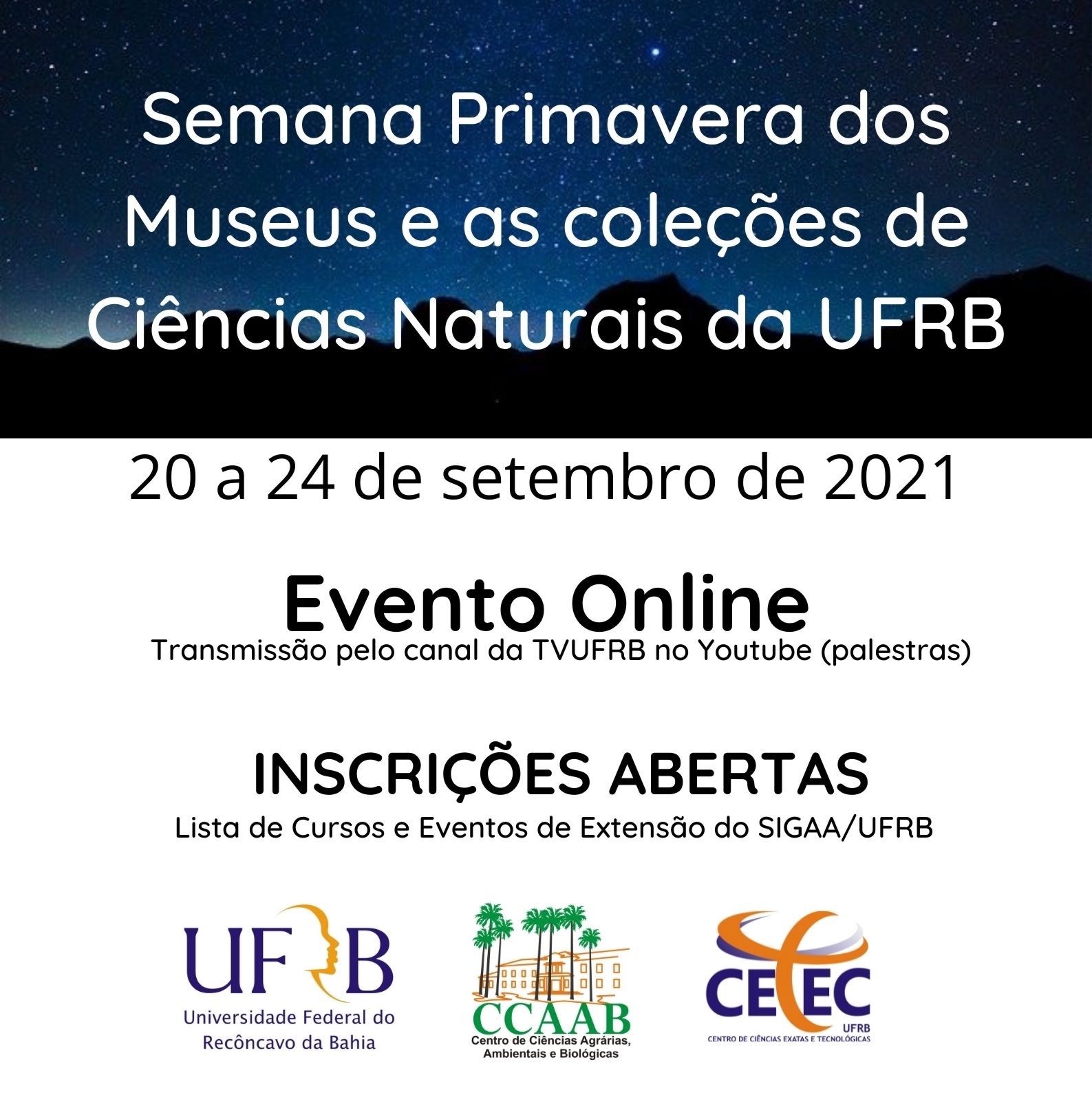 O Centro de Ciências Agrárias, Ambientais e Biológicas da UFRB divulga para toda comunidade acadêmica a Semana Primavera dos Museus e as Coleções de Ciências Naturais na UFRB, que será realizada no período de 20 a 24/09/2021.
