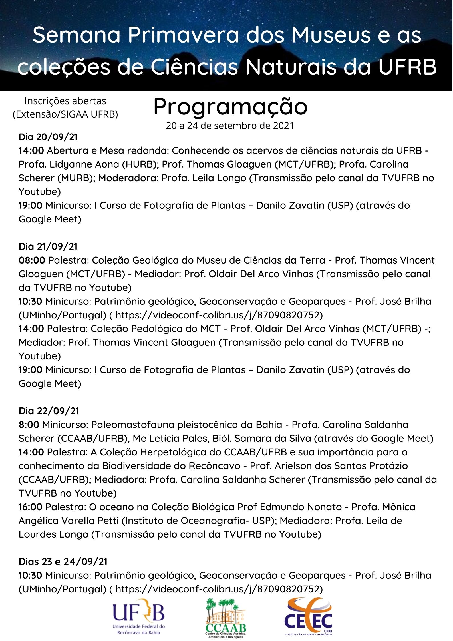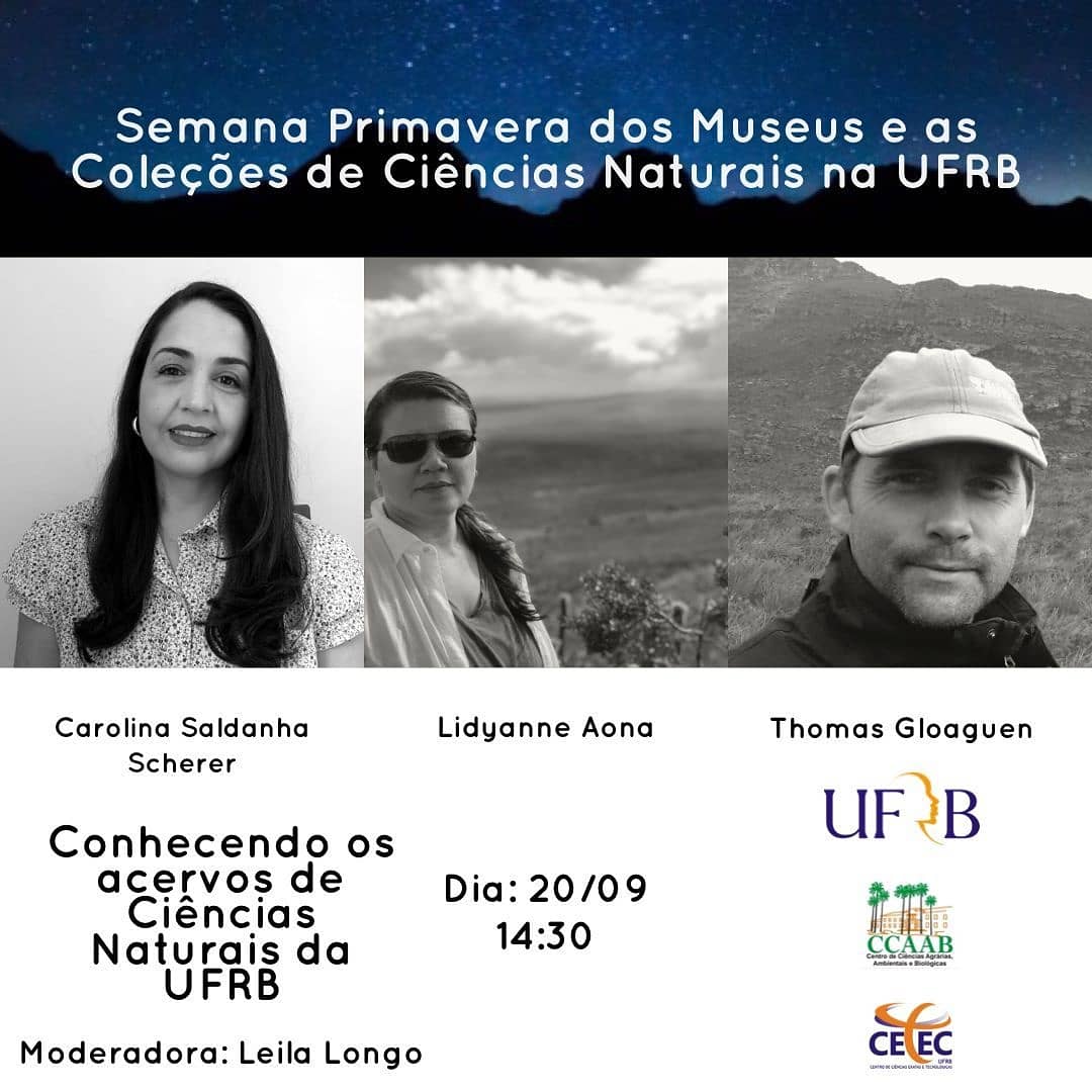 14:00 Abertura e Mesa redonda: Conhecendo os acervos de ciências naturais da UFRB - Profa. Lidyanne Aona (HURB); Prof. Thomas Gloaguen (MCT/UFRB); Profa. Carolina Scherer (MURB); Moderadora: Profa. Leila Longo (Transmissão pelo canal da TVUFRB no Youtube)