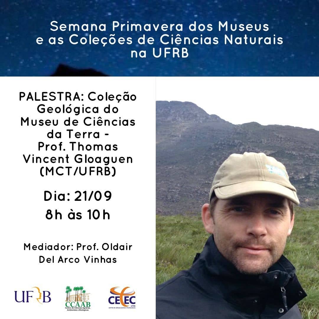 08:00 Palestra: Coleção Geológica do Museu de Ciências da Terra - Prof. Thomas Vincent Gloaguen (MCT/UFRB) - Mediador: Prof. Oldair Del Arco Vinhas (Transmissão pelo canal da TVUFRB no Youtube)
