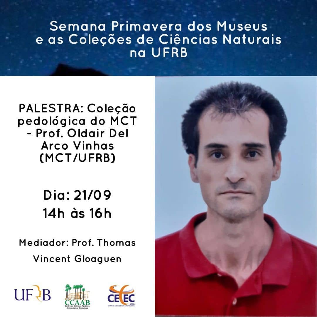 14:00 Palestra: Coleção Pedológica do MCT - Prof. Oldair Del Arco Vinhas (MCT/UFRB) -; Mediador: Prof. Thomas Vincent Gloaguen (Transmissão pelo canal da TVUFRB no Youtube)