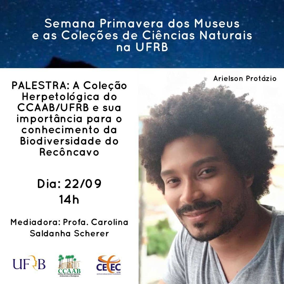 14:00 Palestra: A Coleção Herpetológica do CCAAB/UFRB e sua importância para o conhecimento da Biodiversidade do Recôncavo - Prof. Arielson dos Santos Protázio (CCAAB/UFRB); Mediadora: Profa. Carolina Saldanha Scherer (Transmissão pelo canal da TVUFRB no Youtube)