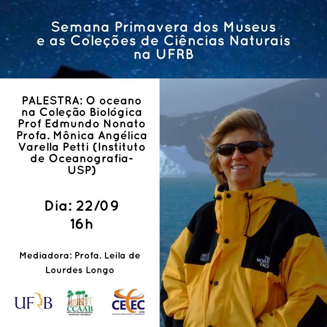 16:00 Palestra: O oceano na Coleção Biológica Prof Edmundo Nonato - Profa. Mônica Angélica Varella Petti (Instituto de Oceanografia- USP); Mediadora: Profa. Leila de Lourdes Longo (Transmissão pelo canal da TVUFRB no Youtube)