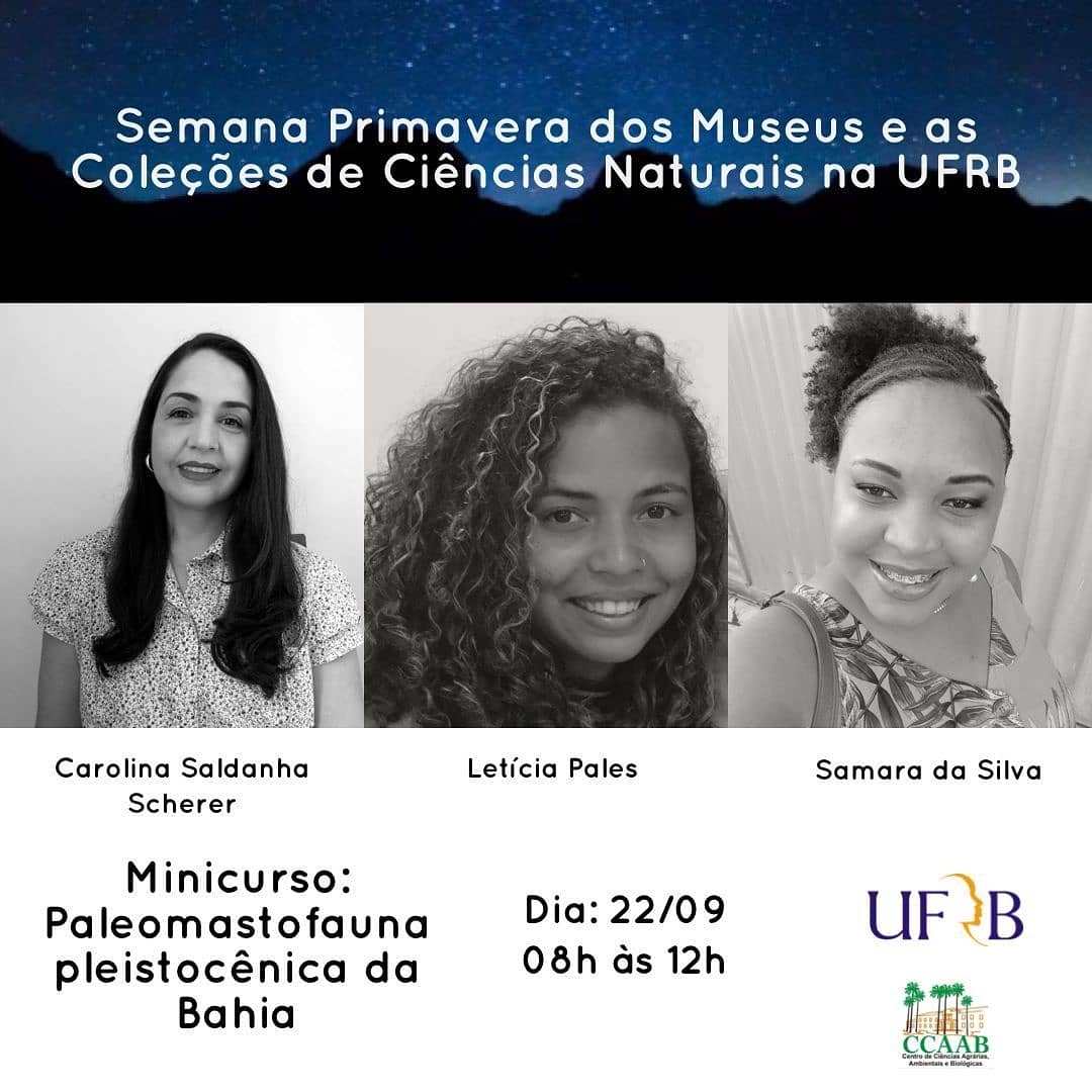 8:00 Minicurso: Paleomastofauna pleistocênica da Bahia - Profa. Carolina Saldanha Scherer (CCAAB/UFRB), Me Letícia Pales, Biól. Samara da Silva (através do Google Meet)