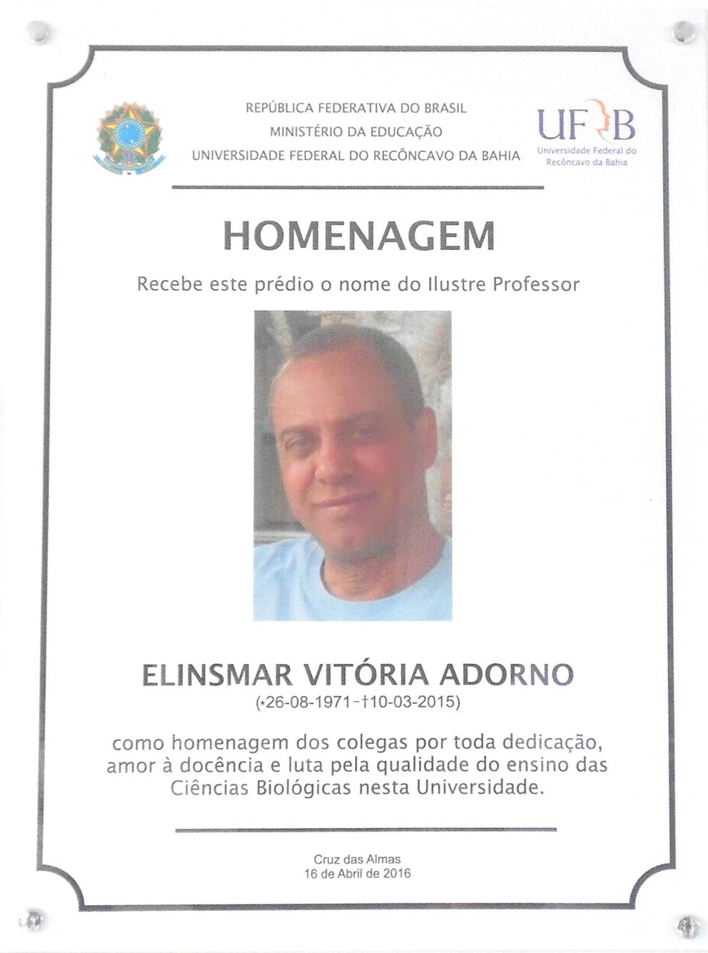 No dia 16 de abril de 2016 foi realizada uma homenagem ao Docente Elinsmar Vitória Adorno (in memoriam). O evento foi organizado pela Comissão designada pelo Conselho Diretor do CCAAB, composta pelos professores Sérgio Schwarz da Rocha, Elissandra Ulbricht Winkaler e Rogério Ferreira Ribas. Estiveram presentes o Magnífico Reitor da UFRB, Professor Sílvio Luis de Oliveira Soglia, o Diretor do CCAAB, Professor Elvis Lima Vieira, o Vice-Diretor do CCAAB, Professor Josival Santos Souza, o Pró-Reitor de Gestão de Pessoal, Sr. Wagner Tavares da Silva, além de Docentes, Servidores Técnico-Administrativos e Discentes de diversos Centros da UFRB. Para receber a homenagem estiveram presentes a Sra. Otavia Vitória Adorno, mãe do Professor Elinsmar Adorno, as Sras. Elisângela Vitória Adorno e Maria Consuelo Adorno de Araújo (irmãs do professor) e a sobrinha Poliana Ramalho Adorno.