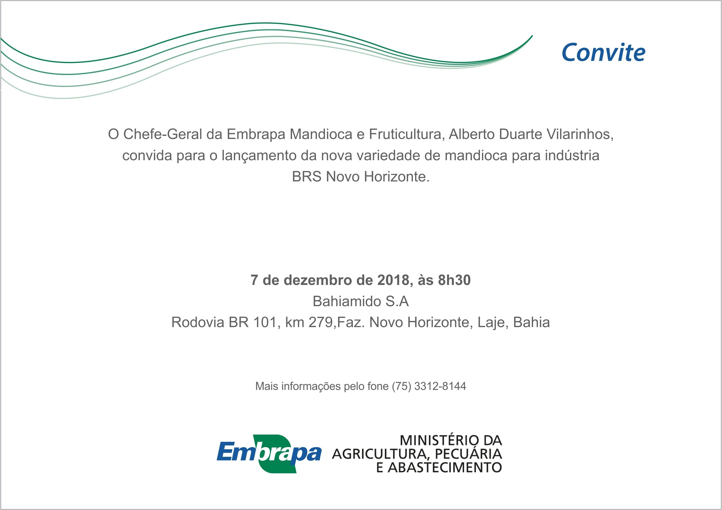 O Chefe-Geral da Embrapa Mandioca e Fruticultura, Alberto Duarte Vilarinhos, convida para o lançamento da BRS Novo Horizonte, nova variedade de mandioca para indústria.