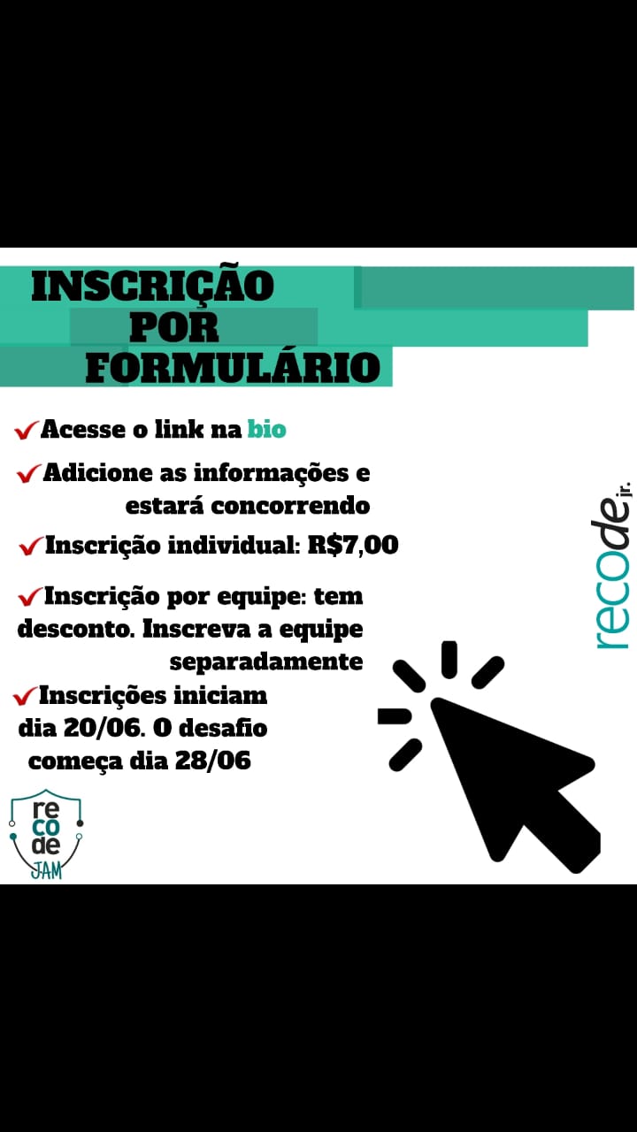 Vai perder esta oportunidade? As inscrições estão abertas até o dia 27/06 , e poderão ser feitas pelo site www.recodejr.com ou pelo link na bio do INSTAGRAM da Recode Jr (@recodejr).