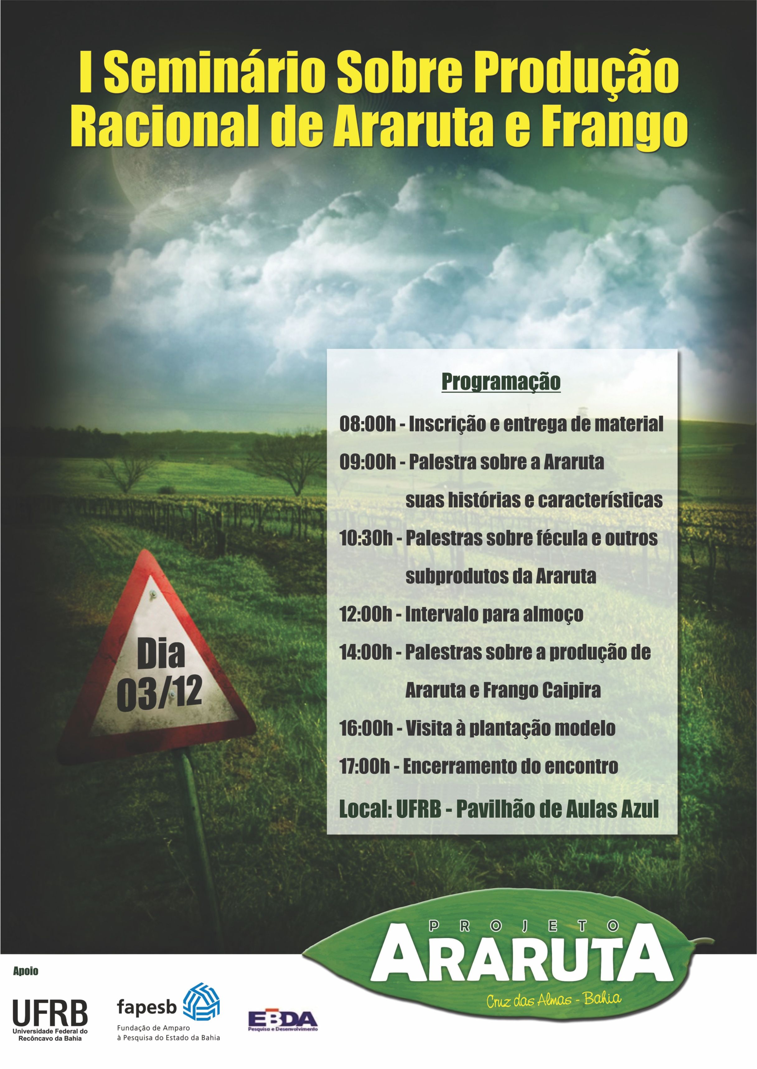 O I SEMINÁRIO SOBRE PRODUÇÃO RACIONAL DE ARARUTA E FRANGO ocorrerá 03/12, ás 8:00h no PVA 2 da UFRB (Campus de Cruz das Almas). Serão feitas palestras e demonstrações práticas sobre a produção de araruta (Maranta arundinacea) e frango caipira em conjunto.