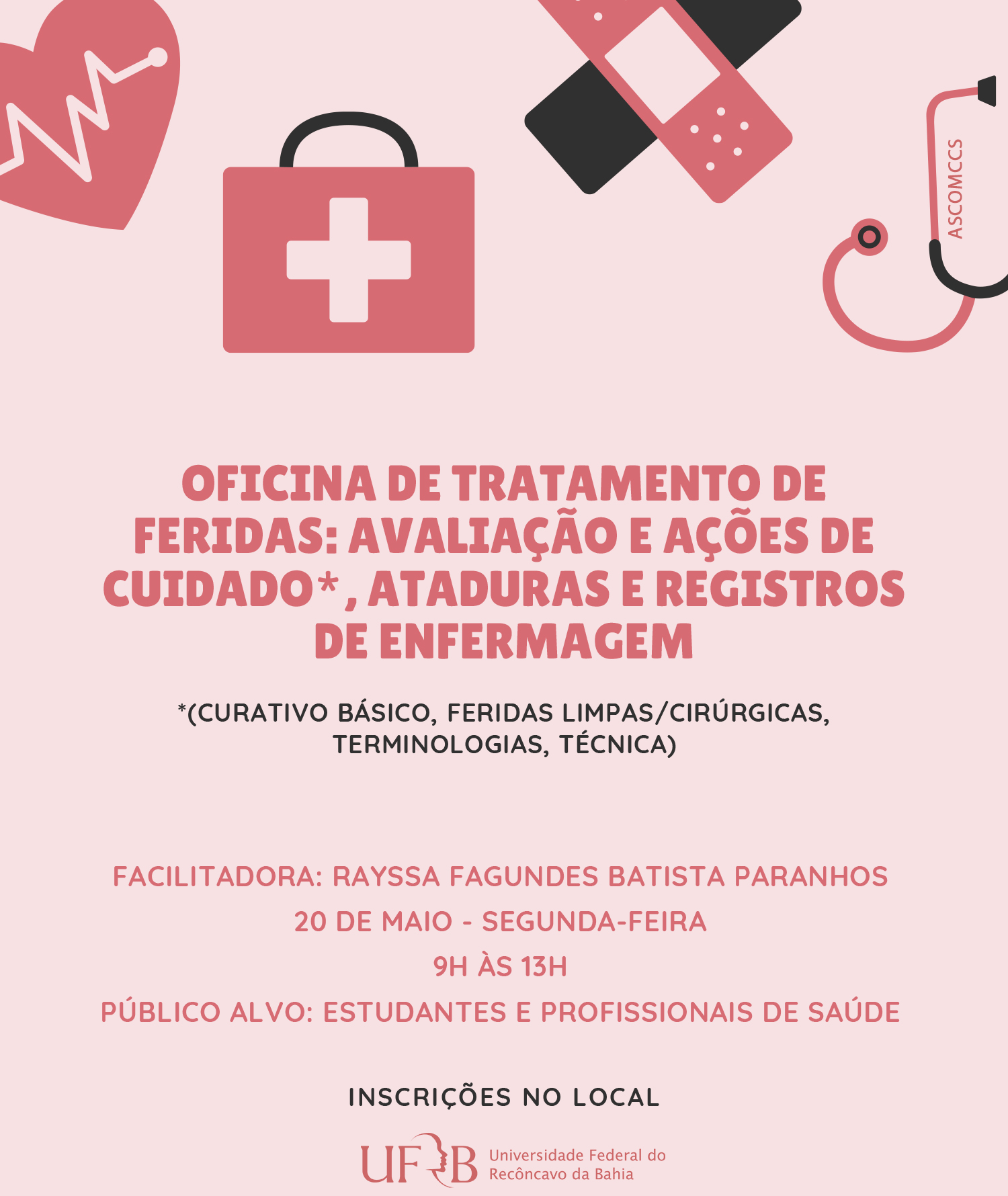 Na próxima segunda-feira, dia 20, de 09h às 13h, acontecerá no Centro de Ciências da Saúde a Oficina de tratamento de feridas: avaliação e ações de cuidado (curativo básico, feridas limpas/cirúrgicas, terminologias, técnica) Ataduras e registros de enfermagem.