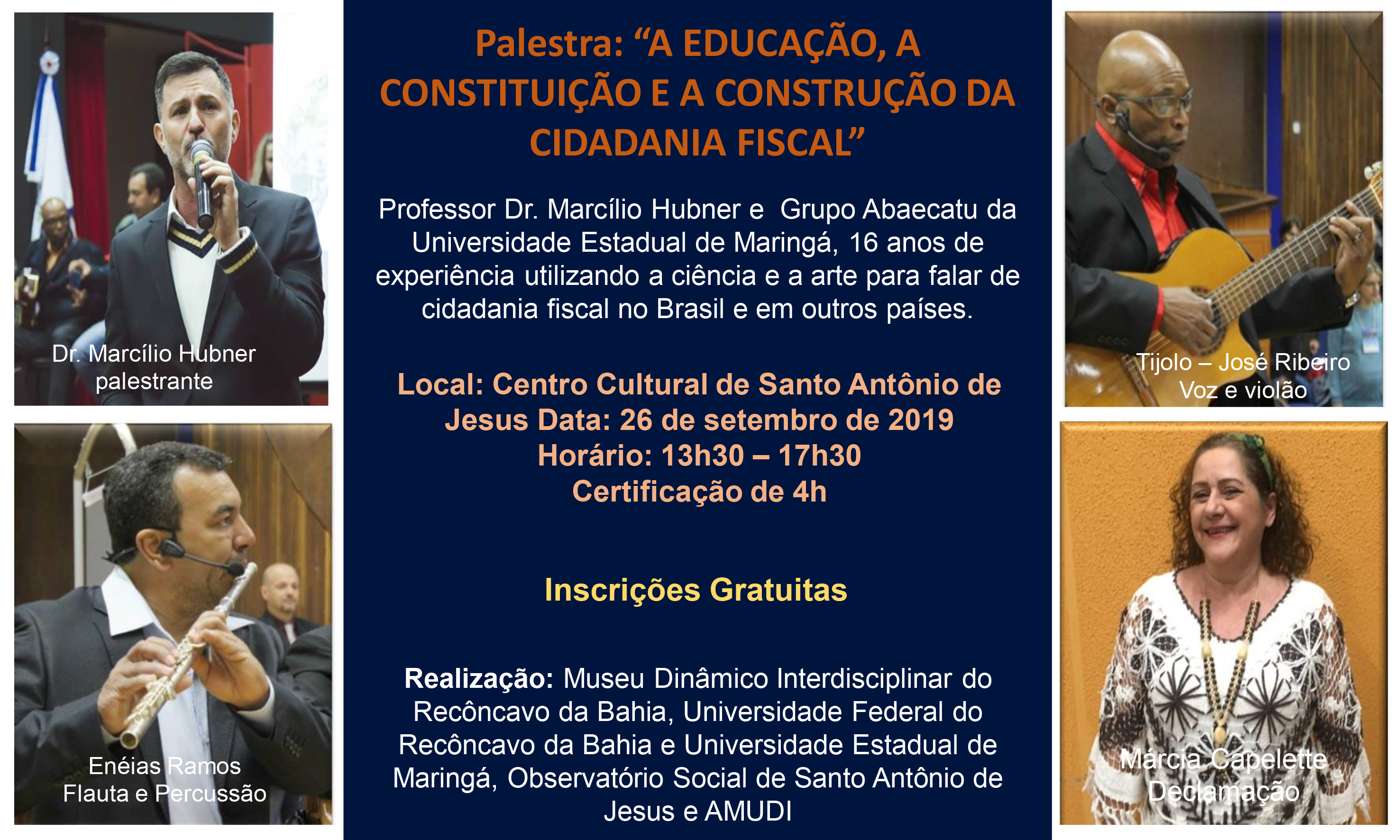 Como parte do Programa Museu Dinâmico Interdisciplinar do Recôncavo da Bahia – MUDIRB, acontece no dia 26 de setembro, no Centro Cultural de Santo Antônio de Jesus, às 13:30h o I Ciclo de Palestras com o tema “A Educação, a constituição e a Construção da Cidadania Fiscal”.