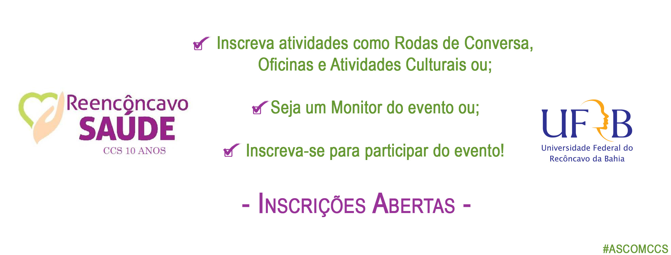 A Programação do Reencôncavo Saúde 2017.2, será divulgada em breve. Mas, as inscrições já podem ser realizadas on line: para participação como ouvinte no evento, para seleção de monitores e para inscrição de atividade.