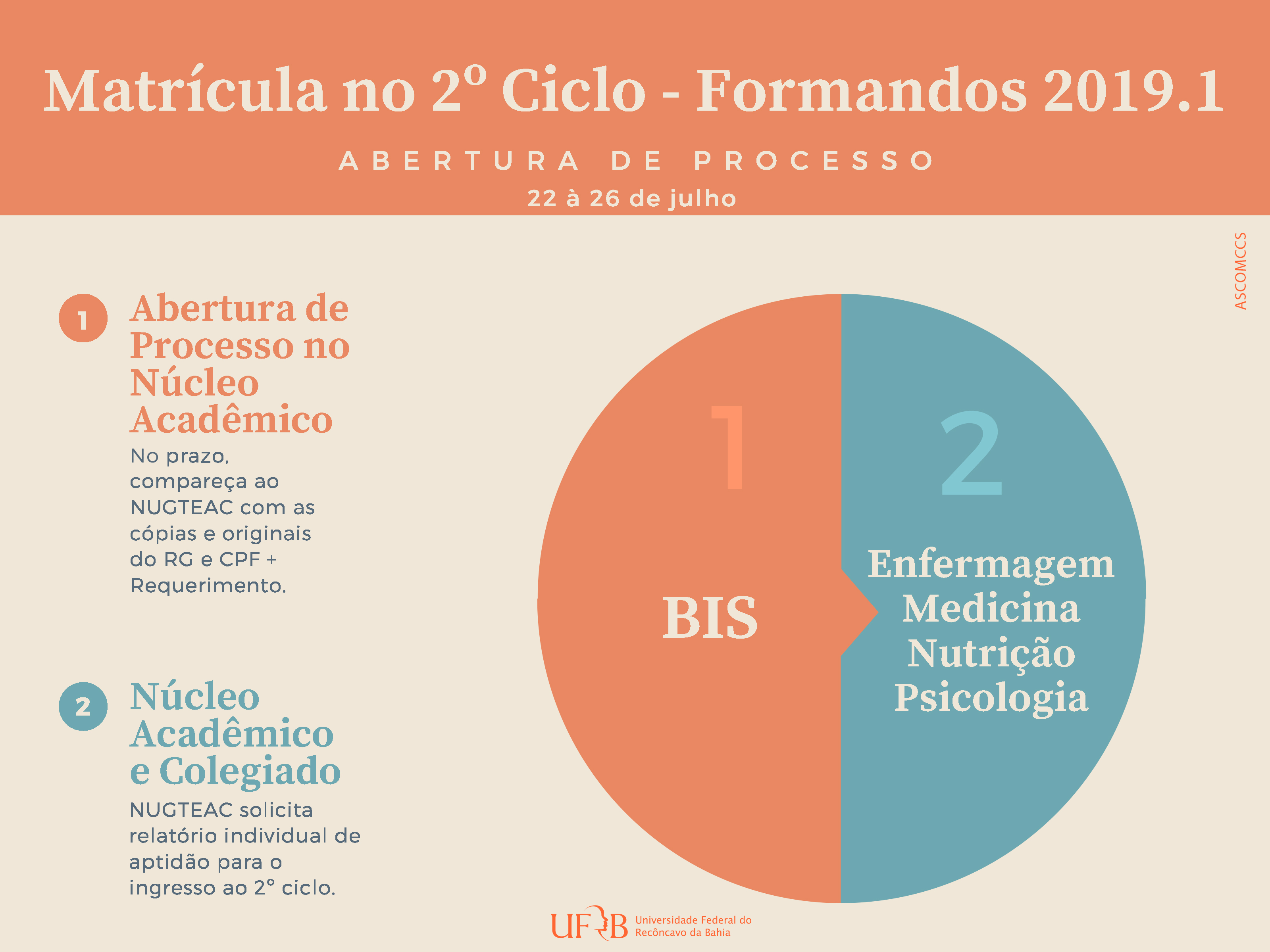 Informamos aos discentes formandos do curso Bacharelado Interdisciplinar em Saúde, com terminalidade definida para os cursos de Enfermagem, Medicina, Nutrição e Psicologia, que o período de abertura dos processos de solicitação de matrícula no segundo ciclo será de 22 à 26 de julho de 2019.