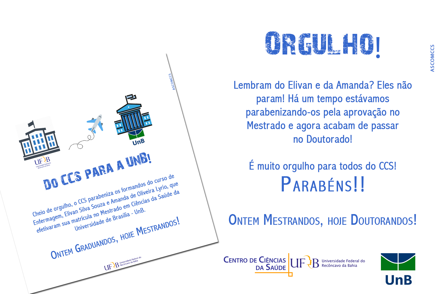 Há um tempo eu recebi a solicitação do Colegiado de Enfermagem para a divulgação da aprovação de Elivan e Amanda no Mestrado da UNB. Apesar da solicitação ser via email, dava para notar o orgulho naquela solicitação. Não é para menos. Ver suas "crias" alçar vôos próprios com o adicional da instituição que estava os recebendo era mesmo um grande motivo de orgulhar-se da qualidade da formação do curso.