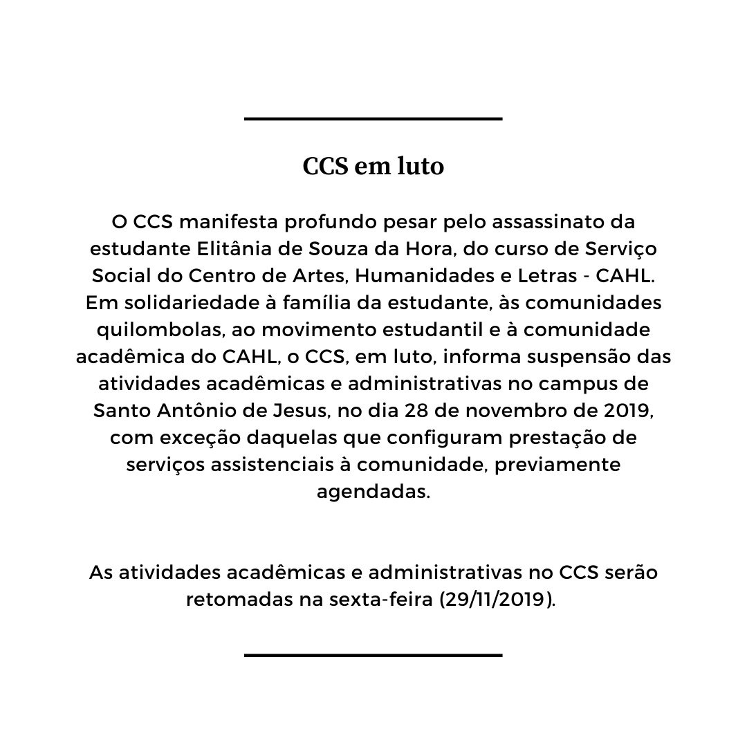 O CCS manifesta profundo pesar pelo assassinato da estudante Elitânia de Souza da Hora, do curso de Serviço Social do Centro de Artes, Humanidades e Letras - CAHL. Em solidariedade à família da estudante, às comunidades quilombolas, ao movimento estudantil e à comunidade acadêmica do CAHL, o CCS, em luto, informa suspensão das atividades acadêmicas e administrativas no campus de Santo Antônio de Jesus, no dia 28 de novembro de 2019, com exceção daquelas que configuram prestação de serviços assistenciais à comunidade, previamente agendadas.
