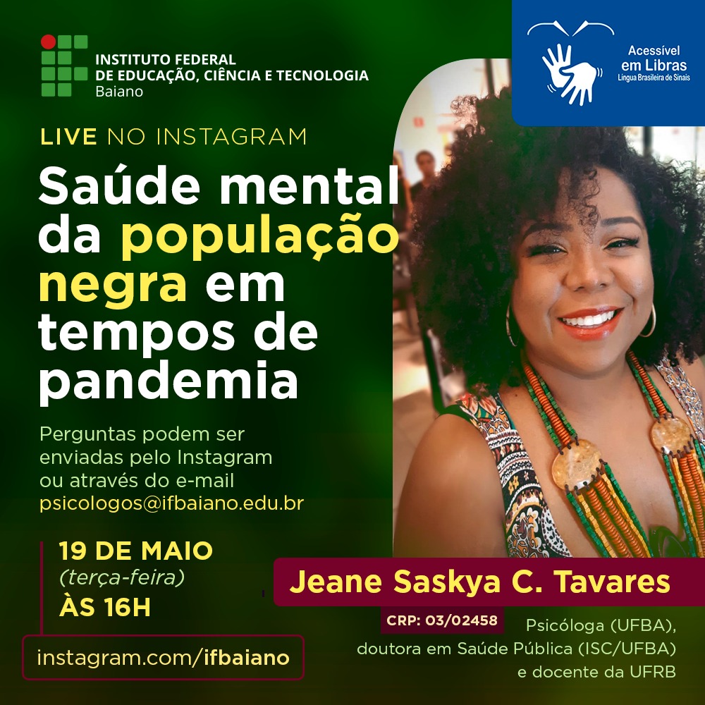 Nesta terça-feira, dia 19, às 16 horas, a professora do CCS/UFRB, Jeane Saskya*, participa de uma Live no Instagram do IFBaiano (@ifbaiano). Jeane traz o tema "Saúde mental da população negra em tempos de pandemia".