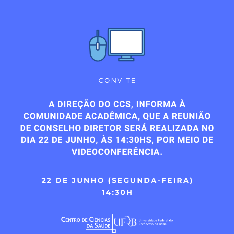 A Direção do CCS, informa à comunidade acadêmica, que a reunião de Conselho Diretor será realizada no dia 22 de junho, às 14:30h, por meio de videoconferência.