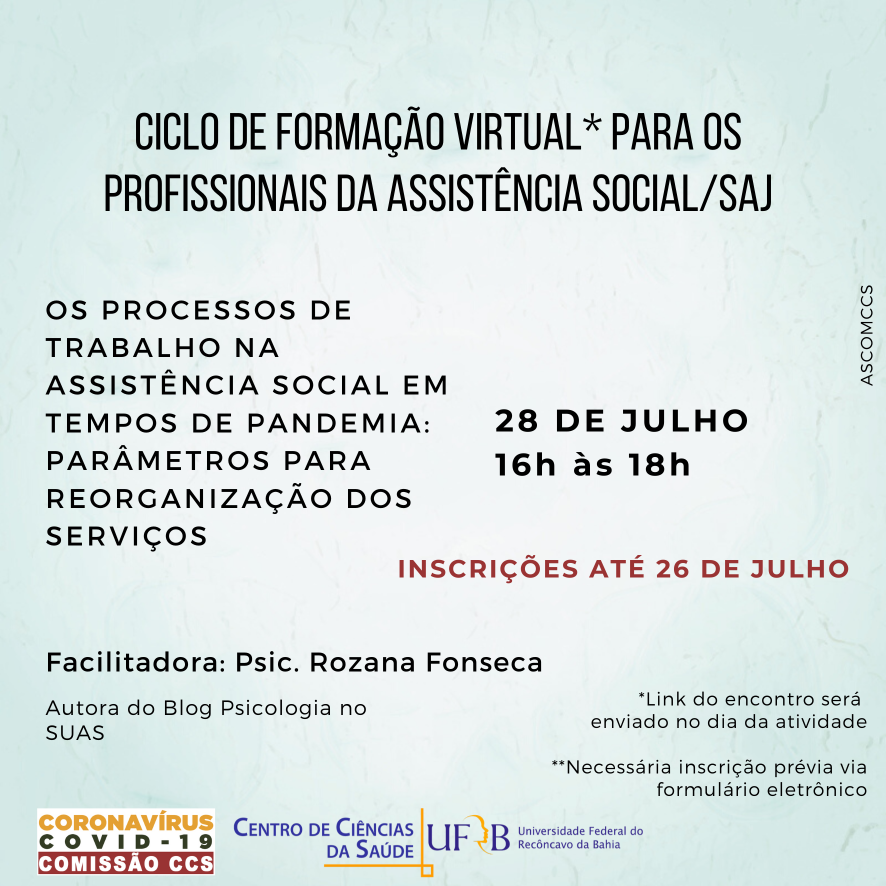 Até o dia 26 de julho, estão abertas as inscrições para a 3ª edição do “Ciclo de Formação Virtual para os Profissionais da Assistência Social/SAJ”. O evento acontecerá no dia 28 de julho, das 16h às 18 horas. Pode se inscrever qualquer profissional que trabalhe no Sistema Único da Assistência Social (SUAS) em Santo Antônio de Jesus. O tema deste encontro será “Os processos de trabalho na assistência social em tempos de pandemia: parâmetros para reorganização dos serviços” ministrado pela Psicóloga Rozana Fonseca, autora do Blog Psicologia no SUAS.