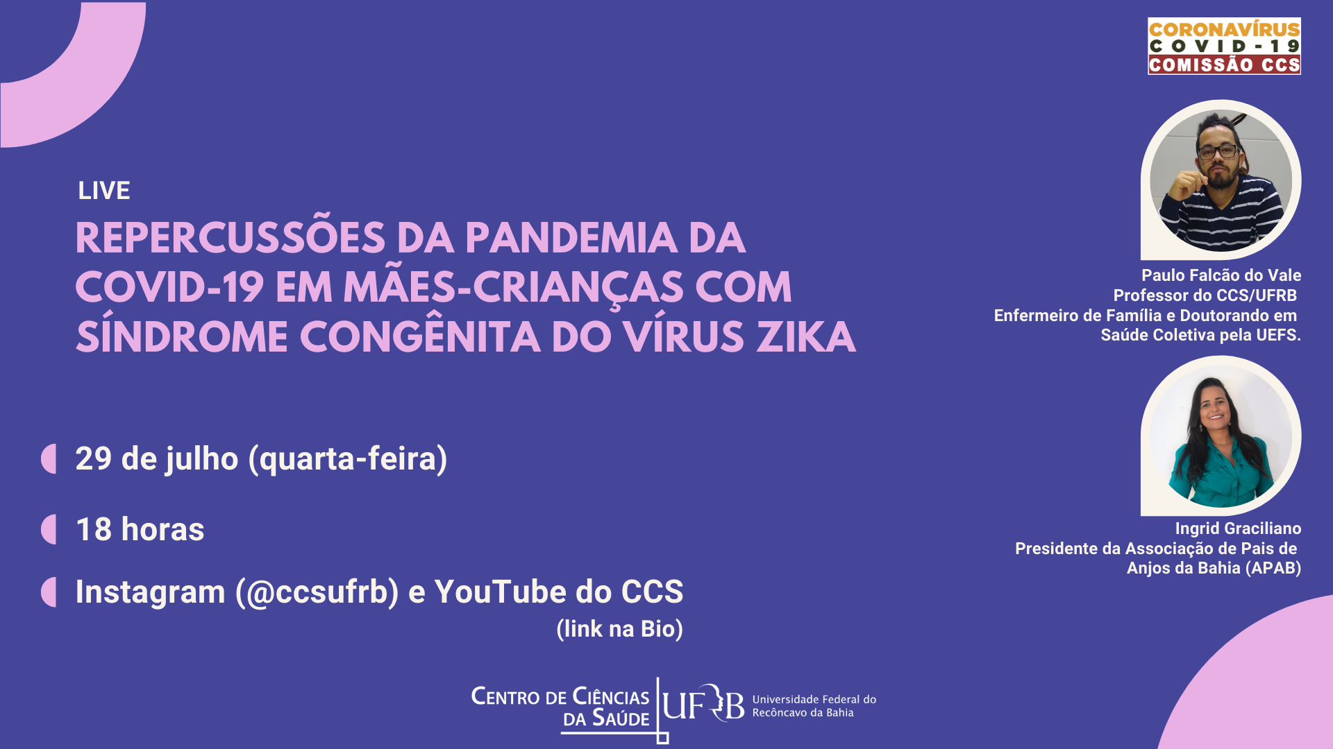 No dia 29 de julho, quarta-feira, às 18 horas, no Instagram do CCS (@ccsufrb), acontece a Live “Repercussões da pandemia da COVID-19 em mães-crianças com Síndrome Congênita do vírus Zika” com Docente do CCS, Paulo Falcão do Vale, e a convidada, Ingrid Graciliano.